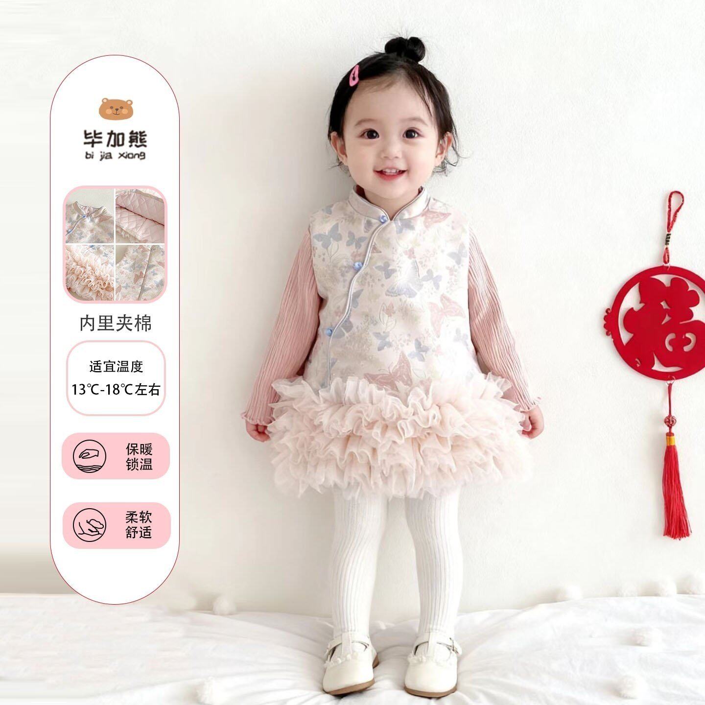 女童连衣裙新中式旗袍粉色背心公主裙女宝宝周岁礼服拜年服套装裙
