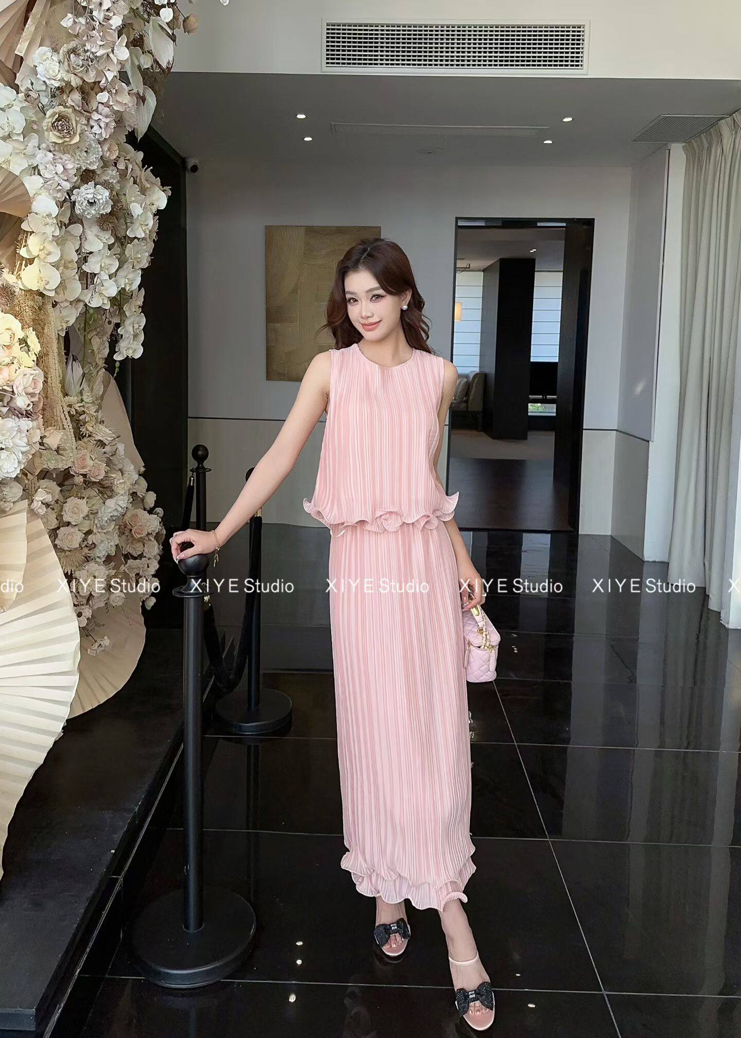 2026春夏新款时尚韩版气质百搭背心上衣百褶雪纺两件套装半身长裙