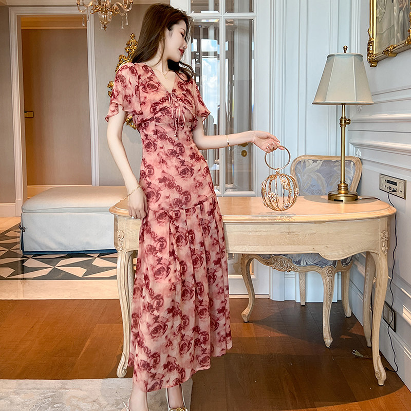 哺乳雪纺文艺两件套背心连衣裙雪纺短袖上衣显瘦连衣裙气质中长款