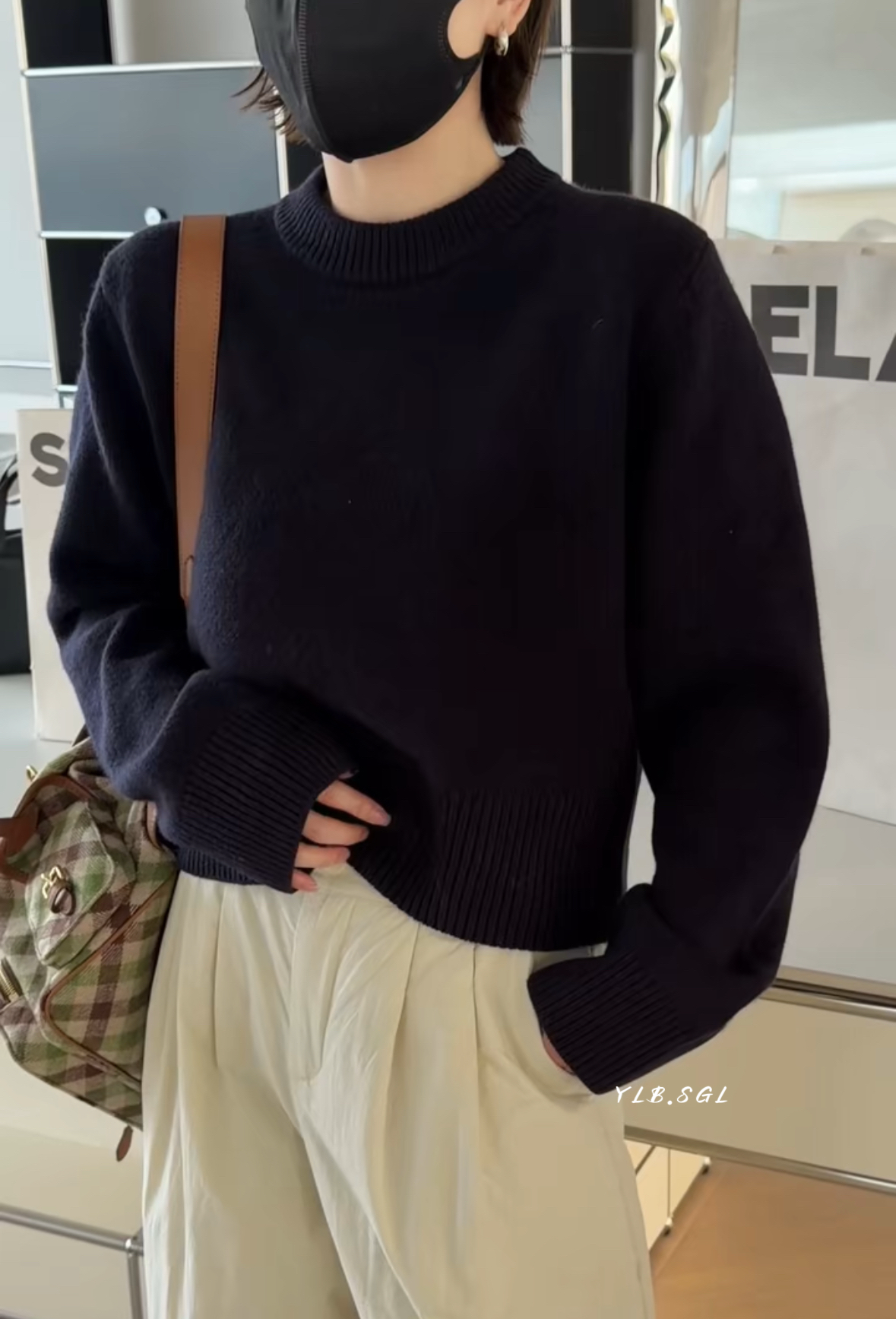 1226诗歌兰女装2025冬款 百搭气质藏青蓝圆领短款显瘦收腰毛衣女