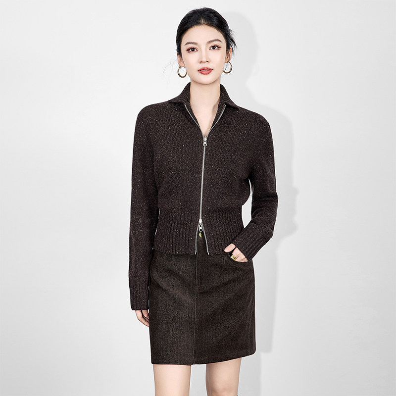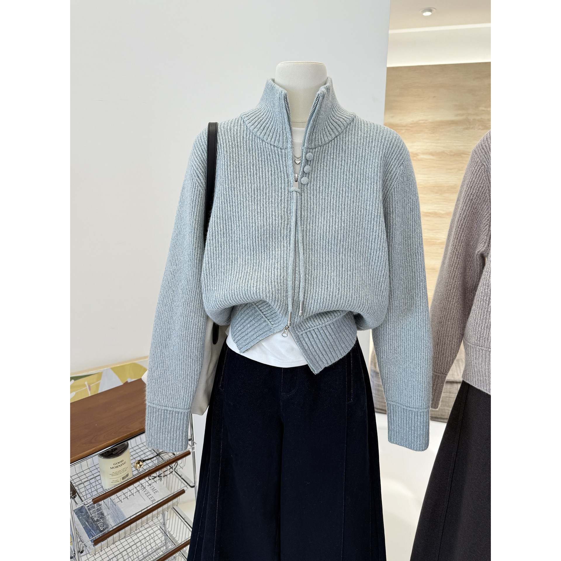 纯羊毛翻领双拉链针织衫女士秋冬款新款时尚简约短款毛衣开衫外套