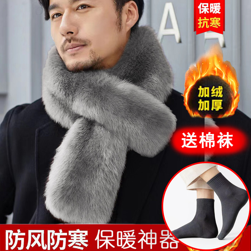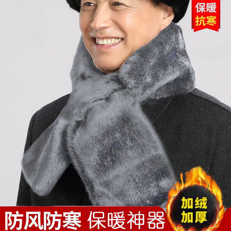 男士防风加绒保暖围脖秋冬加厚中老年户外皮草老人纯色围巾送父亲