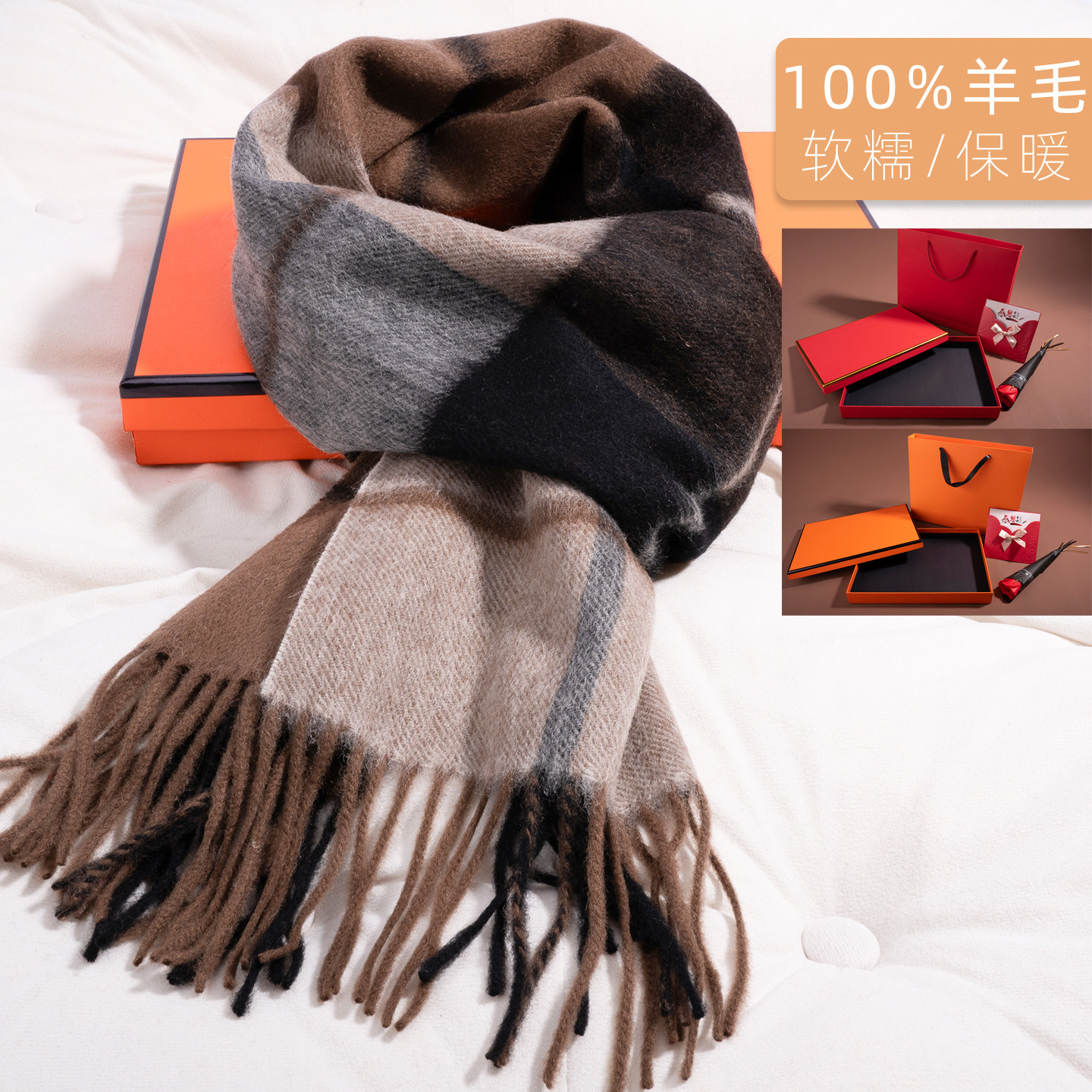 纯羊毛格子老人围巾男冬季送爸爸爷爷中老年中年保暖礼盒装送长辈