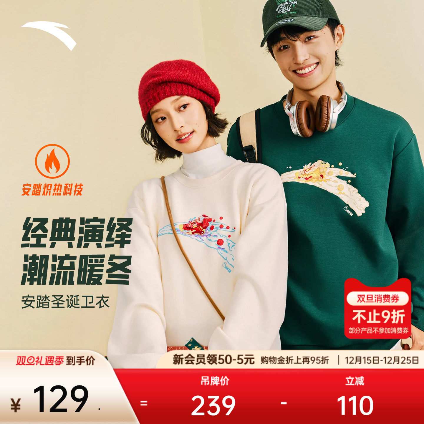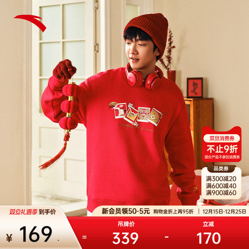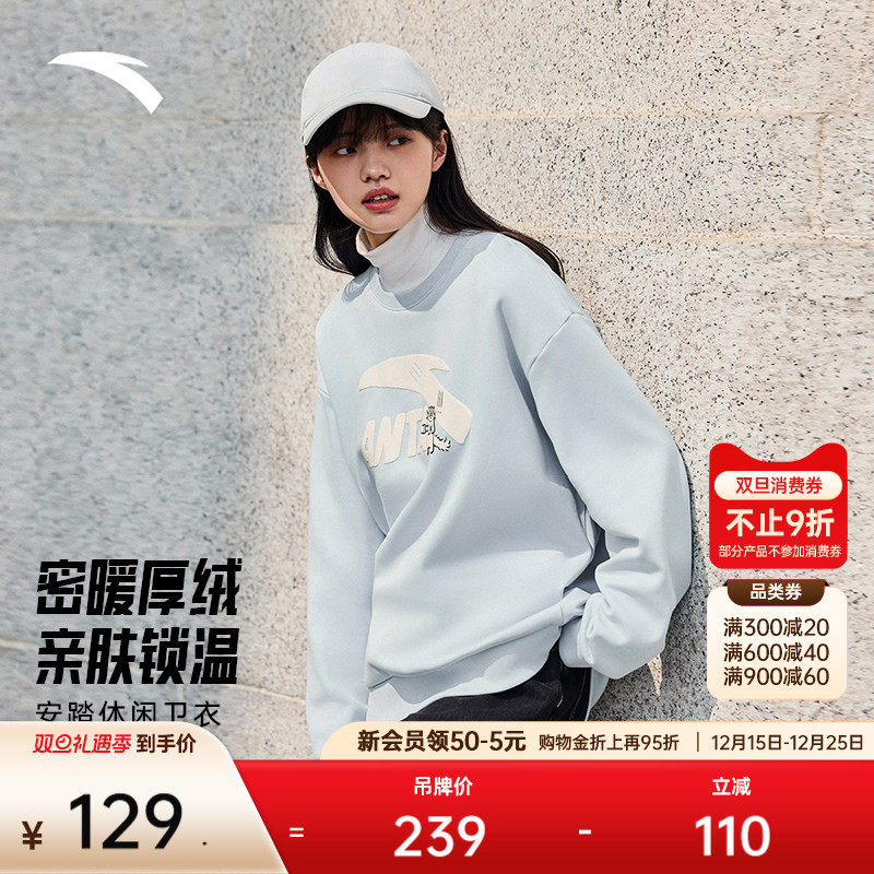 安踏加绒套头卫衣男女同款冬季新款趣味圣诞印花宽松休闲运动上衣