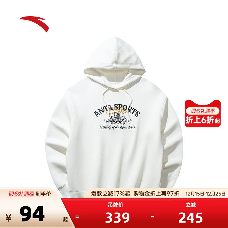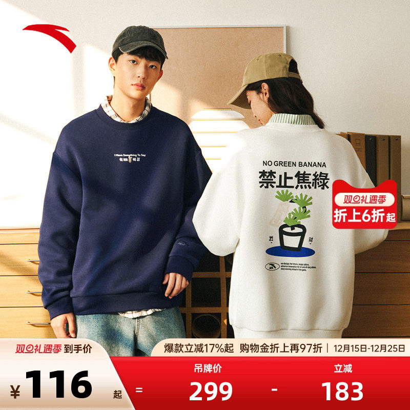 安踏潮流印花套头衫卫衣男女同款冬季加绒休闲长袖上衣152518703N