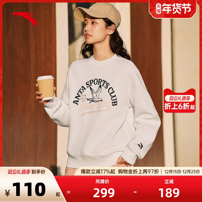 安踏休闲卫衣女士冬季宽松圆领套头衫字母印花长袖运动服百搭上衣