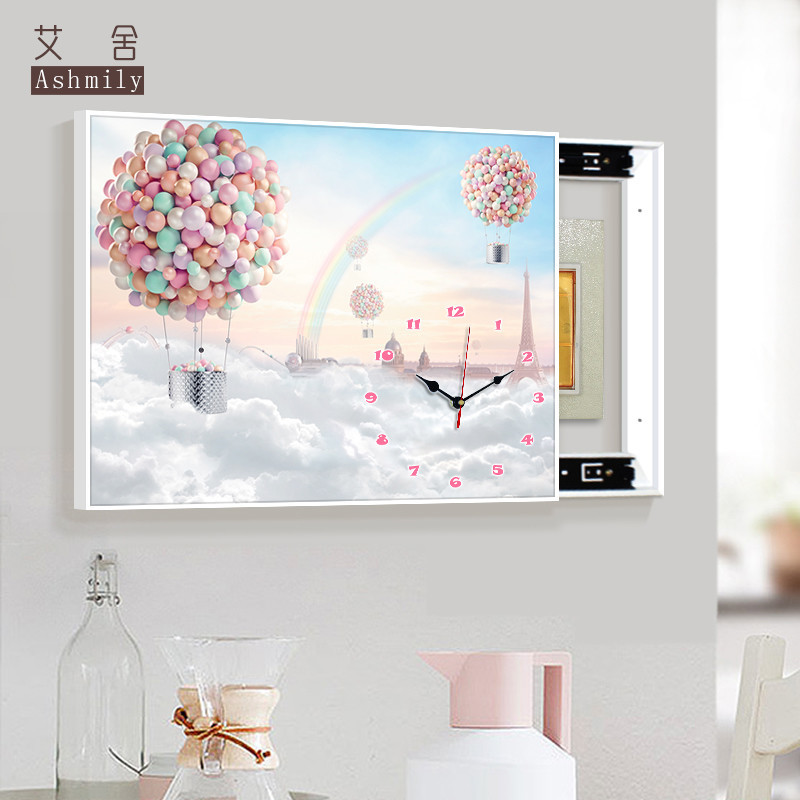 现代简约电表箱装饰画免打孔带钟表时钟轻奢推拉式配电箱遮挡挂画