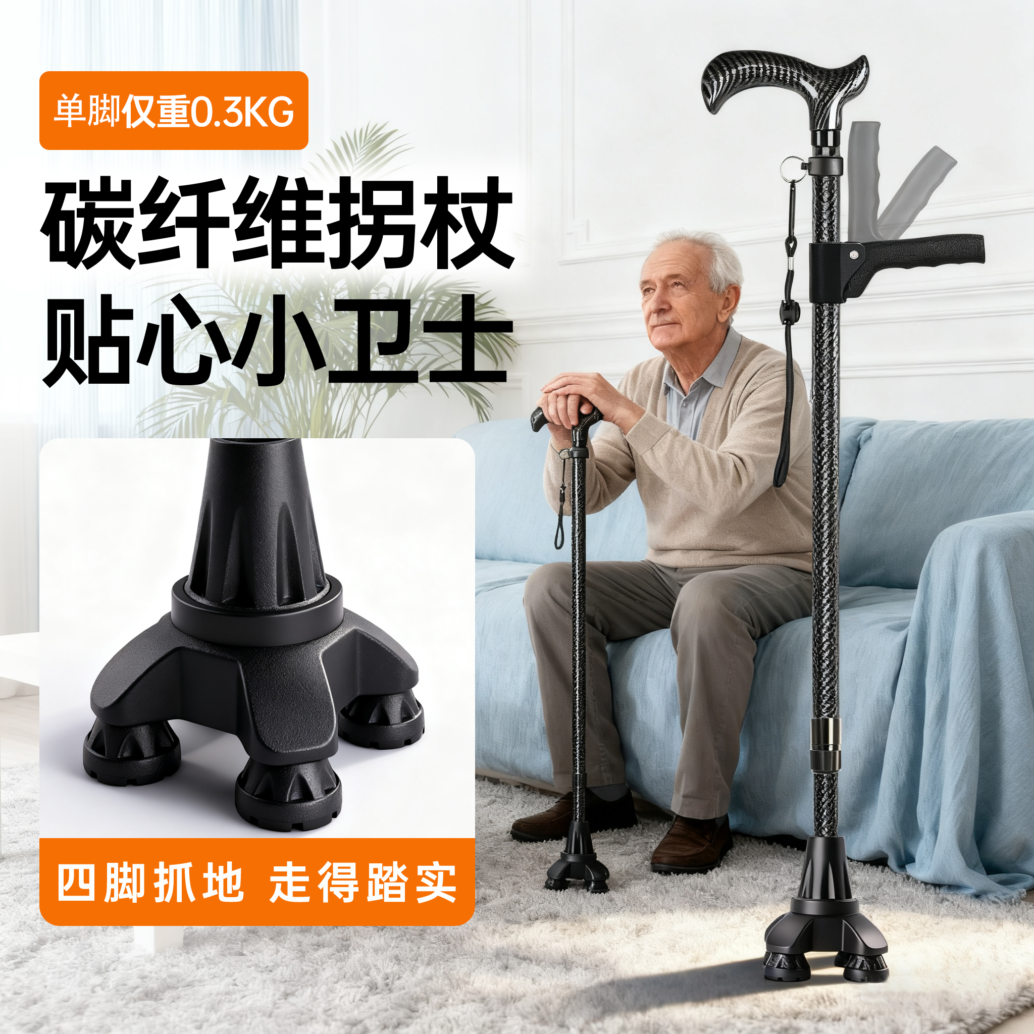 碳纤维四脚拐杖老人用防滑轻便可折叠可伸缩医用康复走路超轻手杖