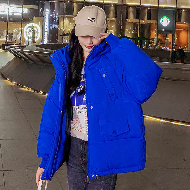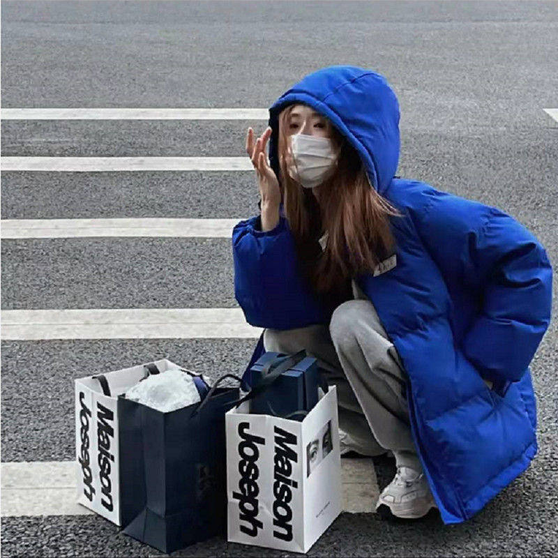 克莱因蓝羽绒棉服女2023冬新款连帽韩版加厚连帽宽松学生面包服