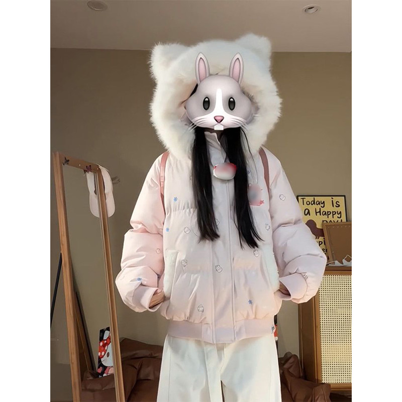 韩版ins学院百搭粉色连帽毛领棉服女学生可爱满印保暖加厚面包服