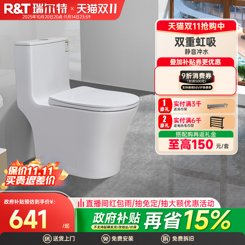 瑞尔特普通家用马桶静音无棱内壁虹吸卫生间大U节水一体式坐便器
