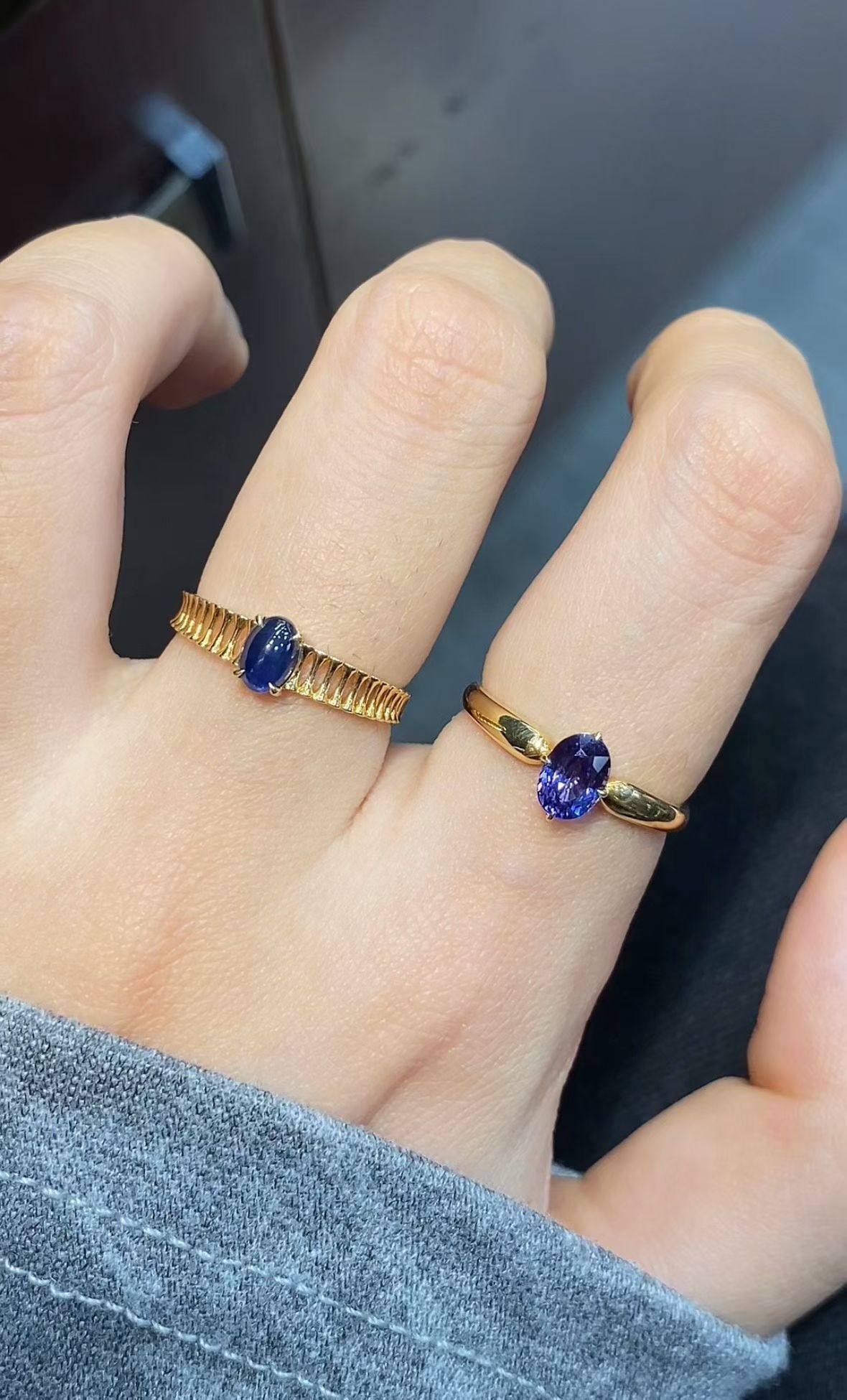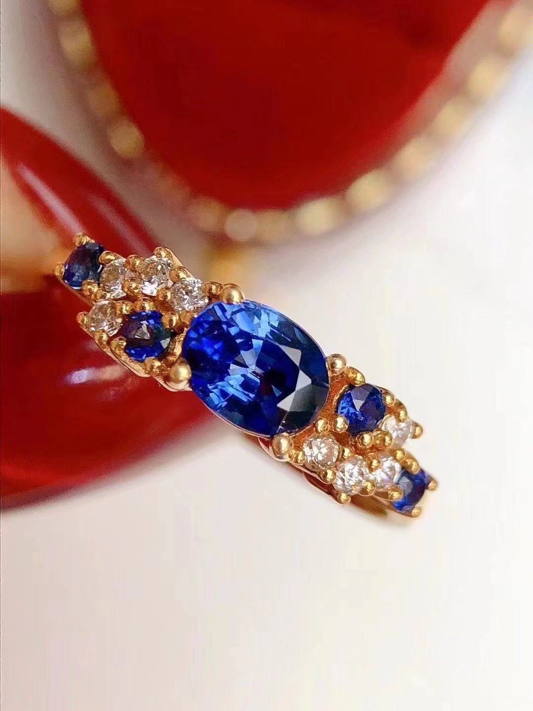 18k金天然蓝宝石戒指深蓝包镶复古女戒定制金珠平价日常椭圆清新