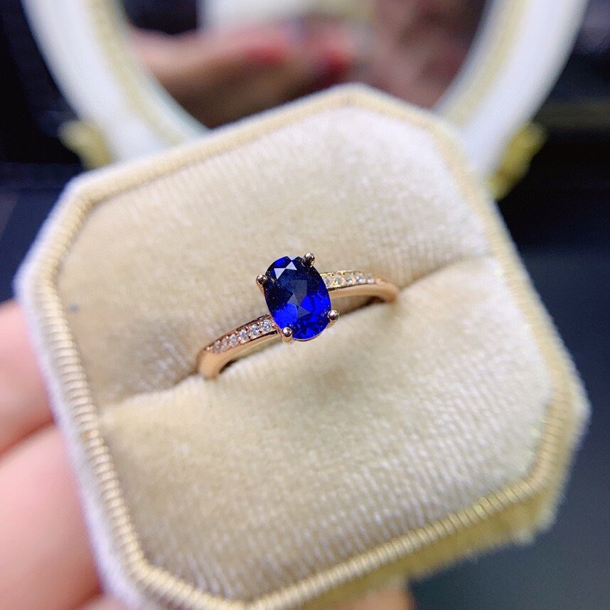 天然蓝宝石戒指925银镀18K玫瑰金镶嵌5*7mm皇家蓝女戒生日礼物