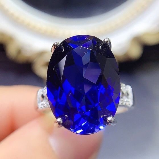 【戒指女】天然托帕石指环奢华蓝宝石女戒银镶钻水晶不褪色不过敏