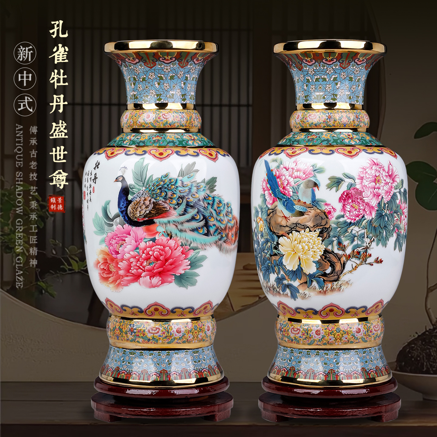 轻奢高端珐琅彩陶瓷花瓶摆件一对凤凰牡丹瓶高级感客厅装饰工艺品