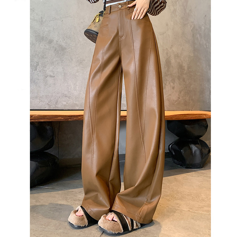 咖色pu皮宽松直筒皮裤女秋冬窄版加长长裤显瘦哑光高腰阔腿休闲裤