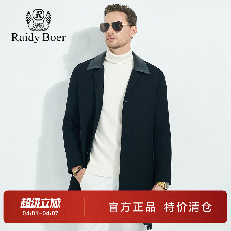 雷迪波尔男装大衣2023秋冬新款绵羊皮翻领羊毛尼中长纯色商务外套