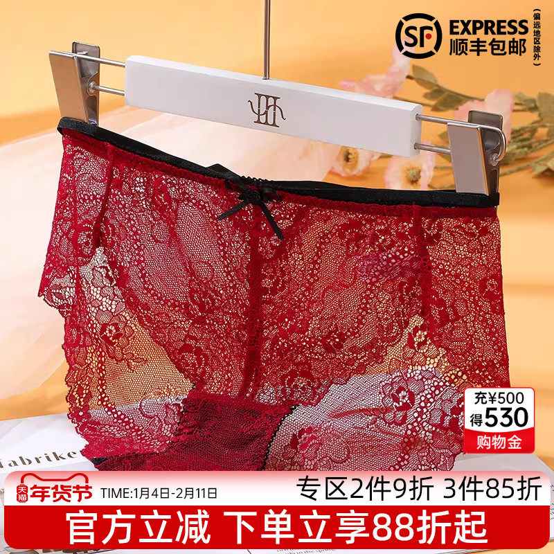 曼妮芬性感蕾丝本命年红色内裤女士三角裤中腰法式浪漫纯棉裆底裤
