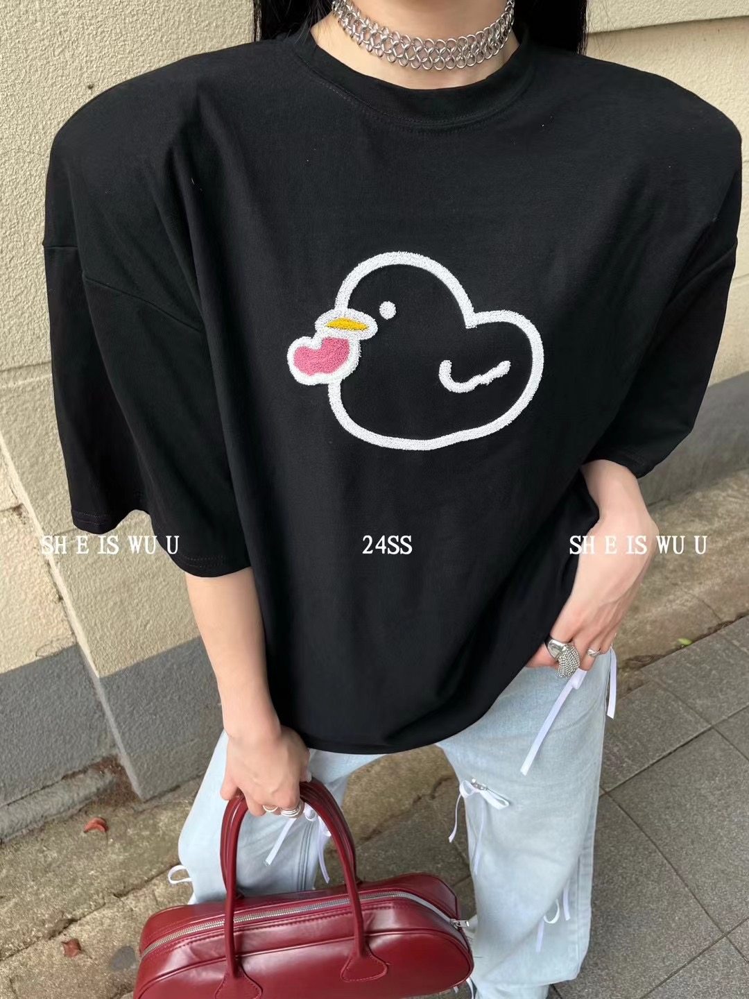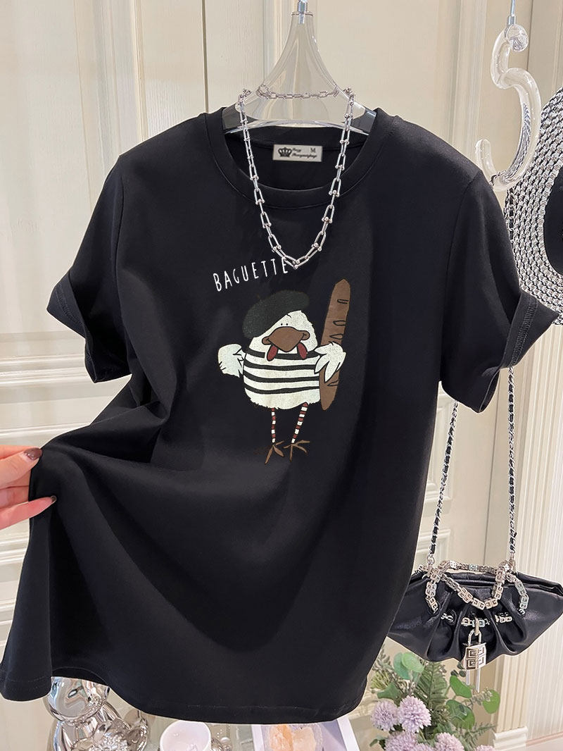 2025新款夏季美式趣味小鸡印花港风大版宽松黑色短袖t恤女中长款