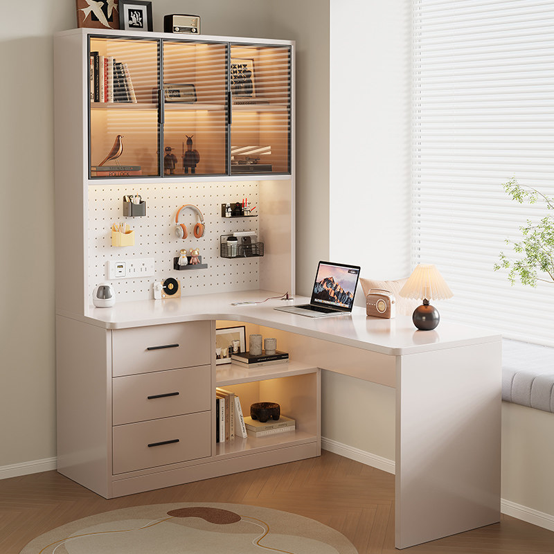 奶油风转角书桌学生家用学习桌书架一体台式拐角洞洞板办公电脑桌