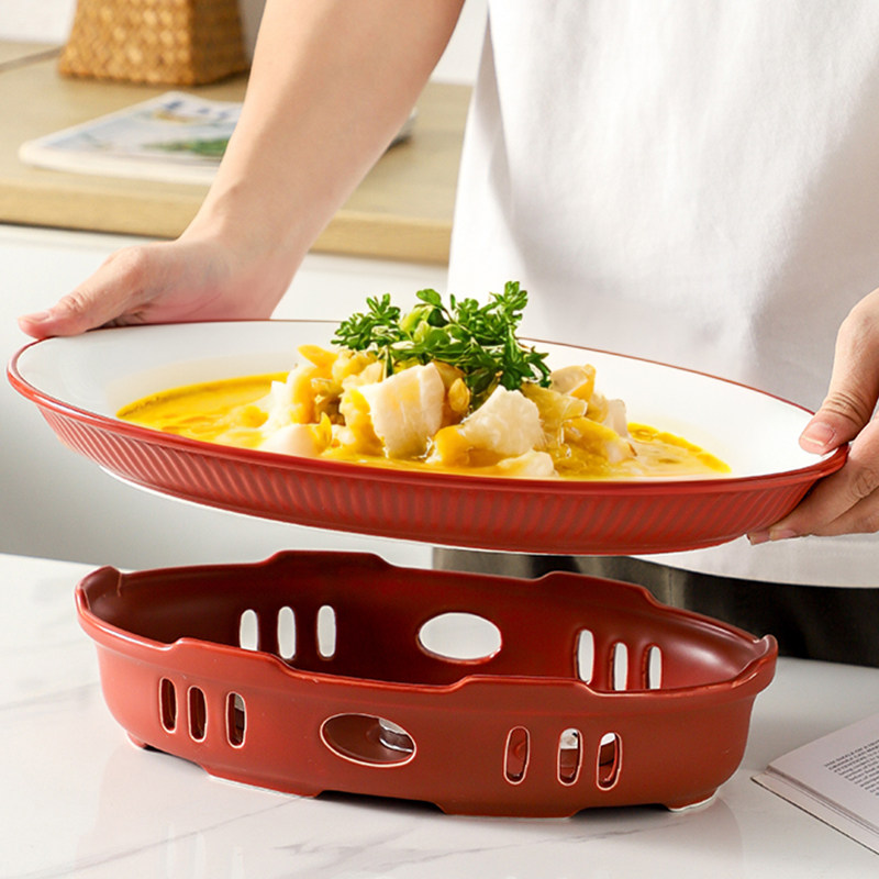 中餐创意特色盘子餐具鱼盘家用北欧高级感10英寸椭圆陶瓷盘蒸鱼盘