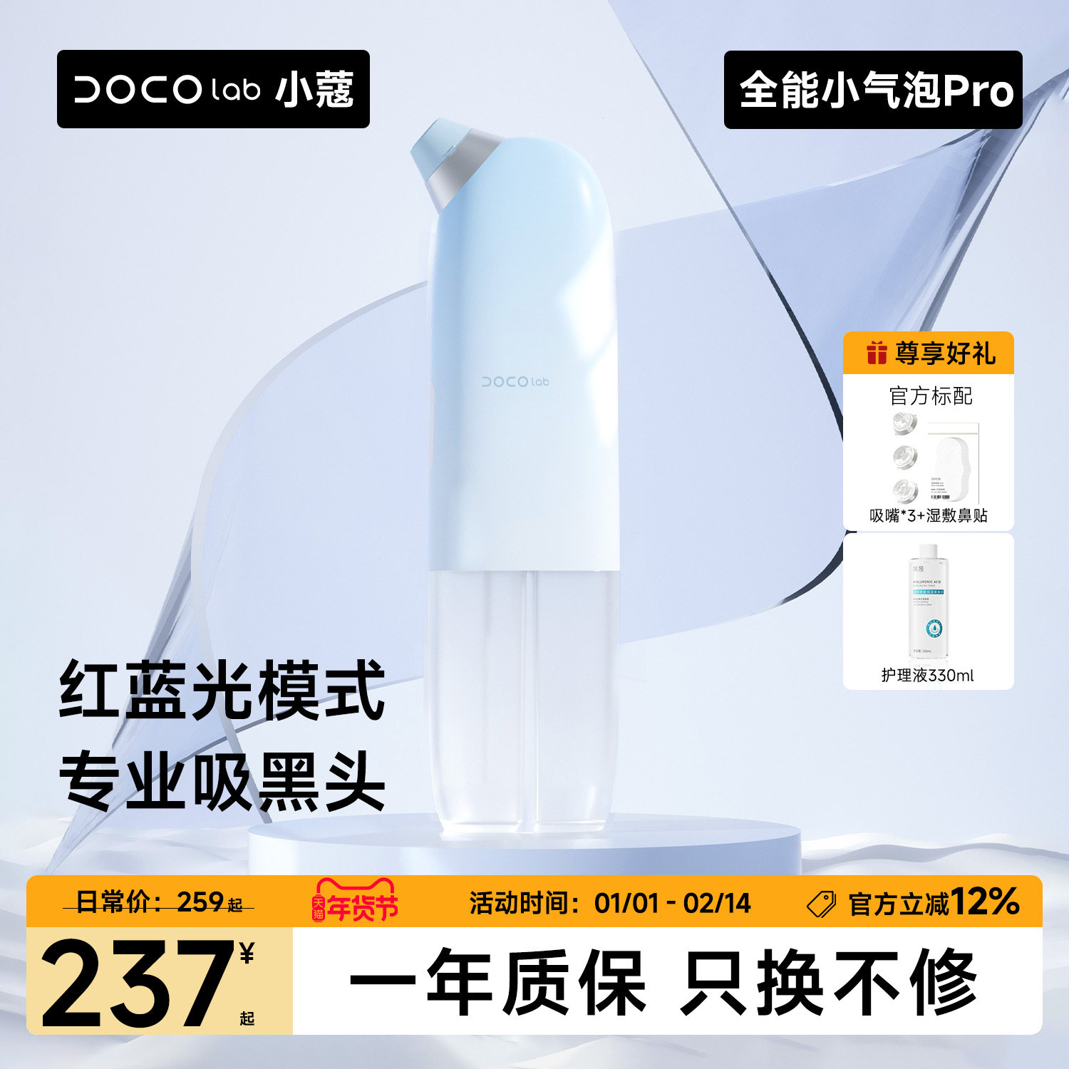 DOCO红蓝光小气泡吸黑头神器脸部美容专用粉刺清洁毛孔电动吸出器