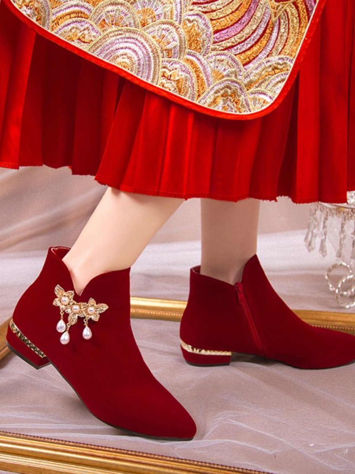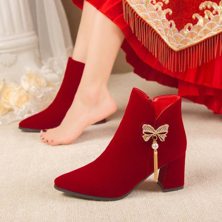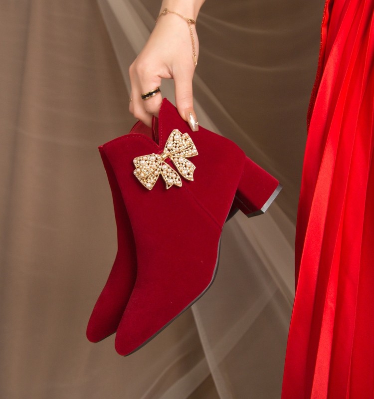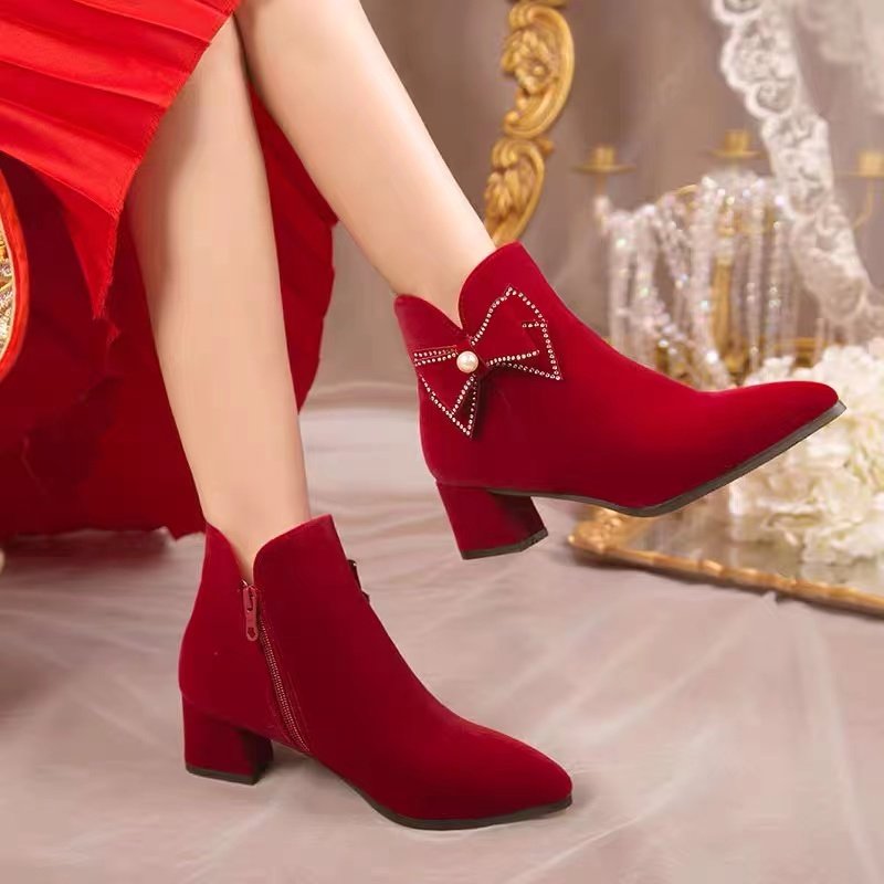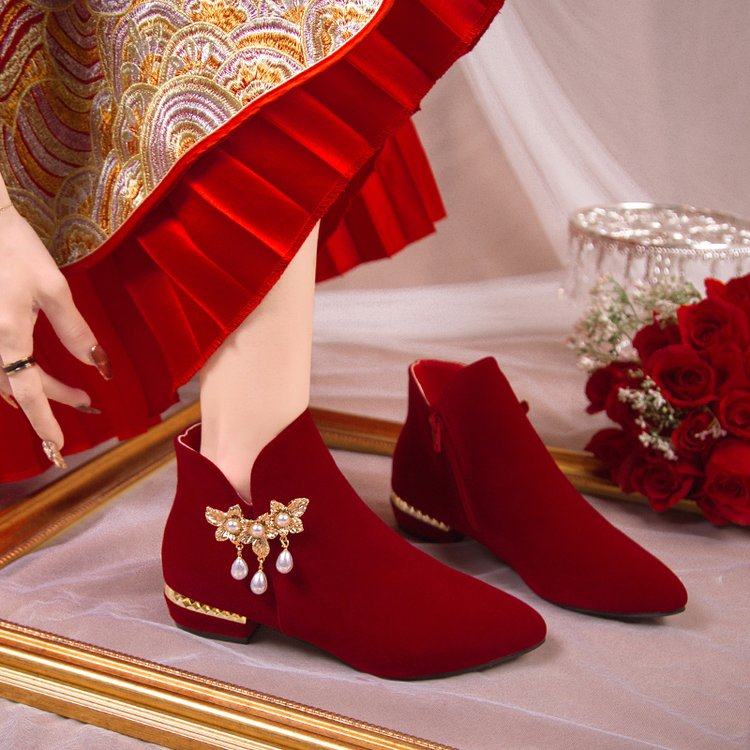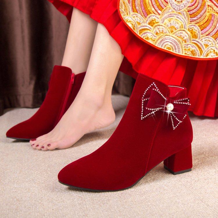 冬天婚鞋女2024年新款粗跟加绒保暖结婚靴子女红色结婚新娘鞋低跟