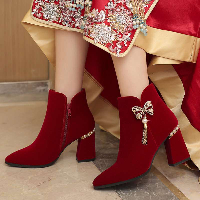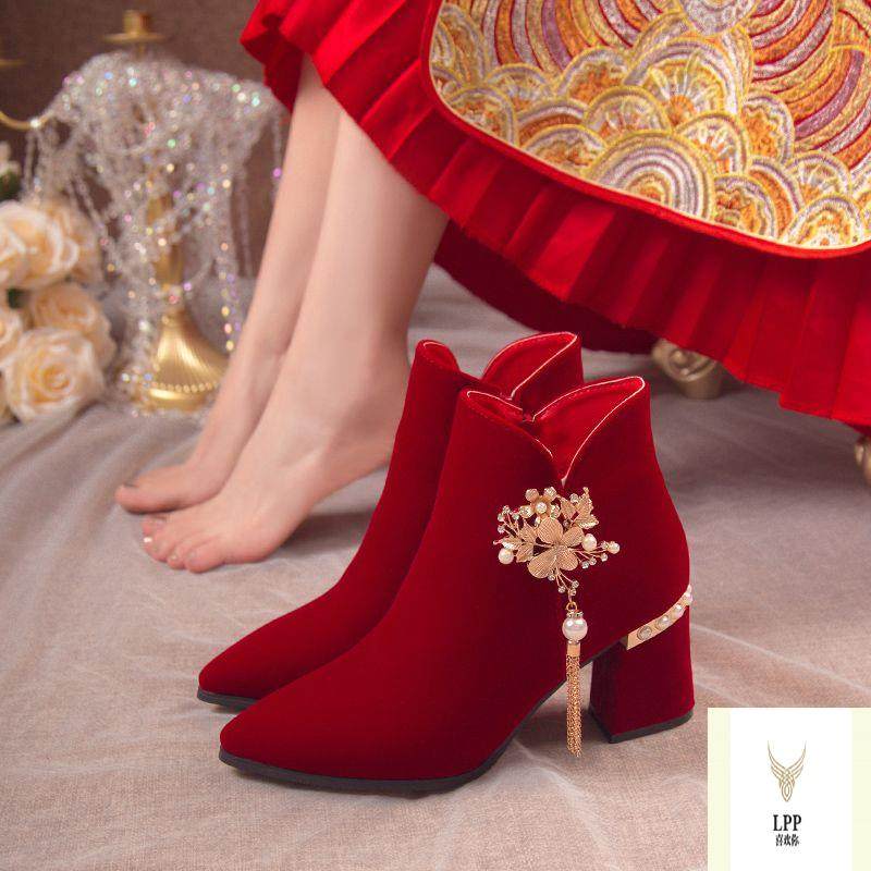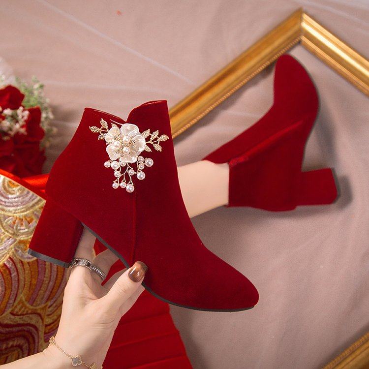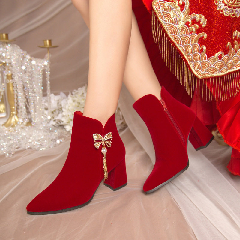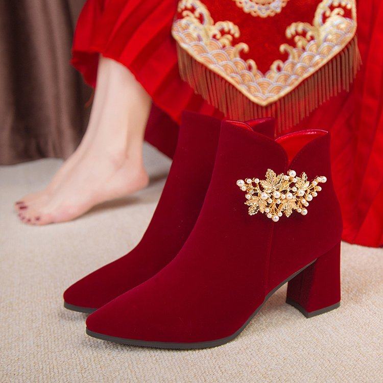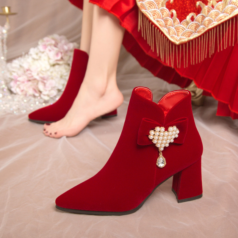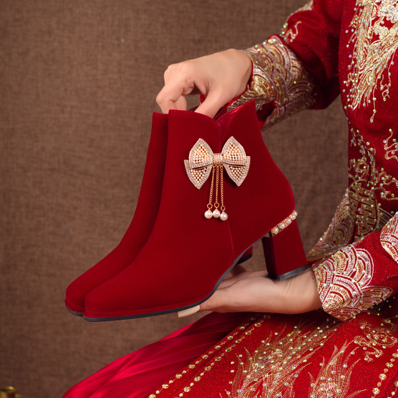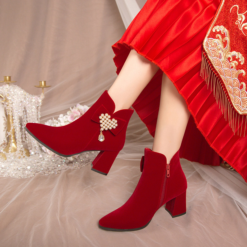婚鞋新娘鞋冬季加绒女粗跟保暖短靴结婚靴女中式红色高跟鞋秀禾鞋
