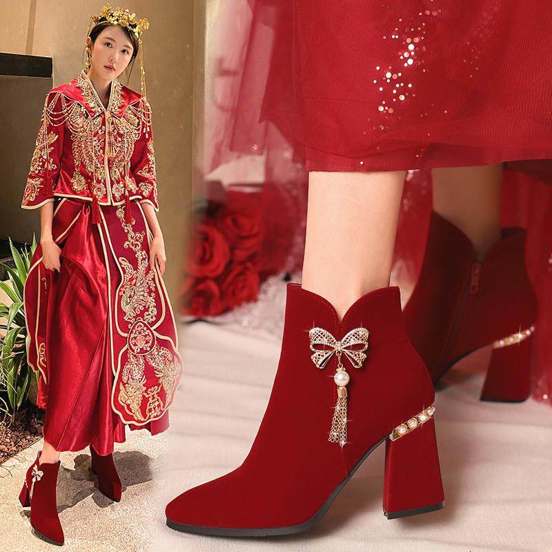 秋冬季结婚鞋女粗跟红色短靴加绒新娘鞋秀禾靴子敬酒高跟冬天订婚