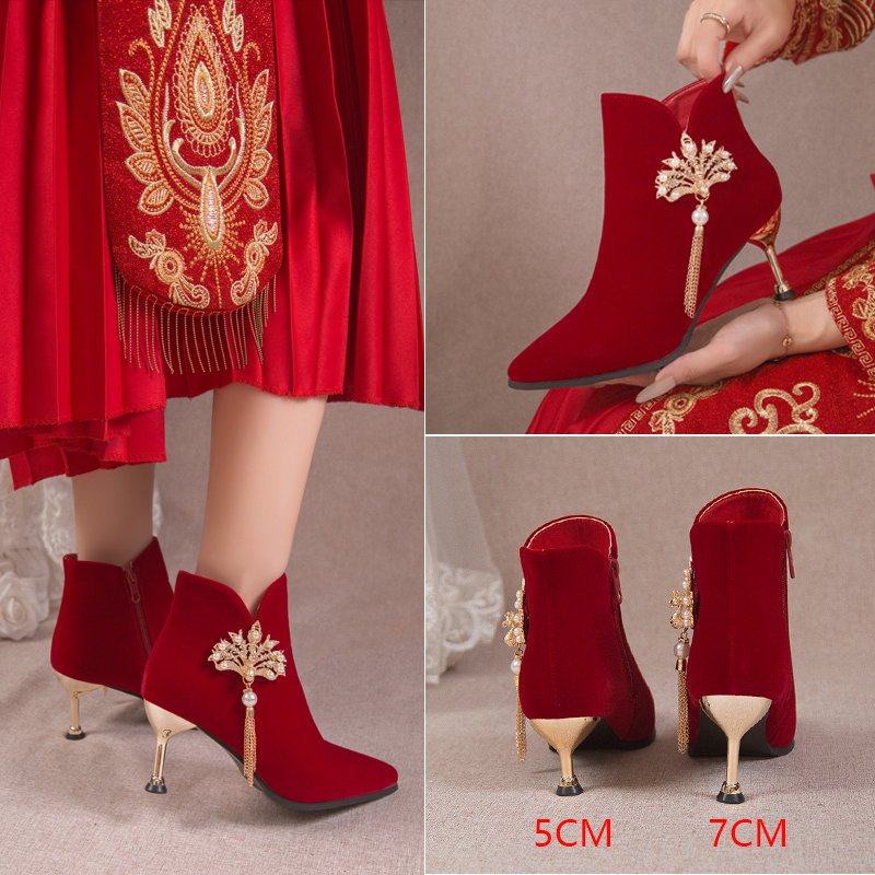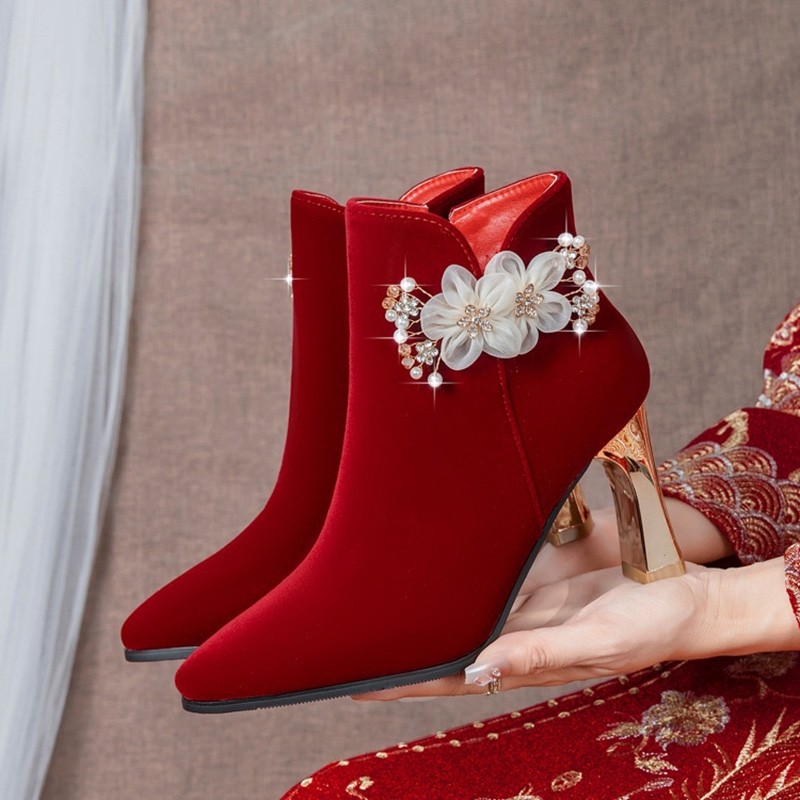 冬季婚鞋女2023新款粗跟新娘结婚靴子秀禾婚纱两穿红色高跟鞋短靴