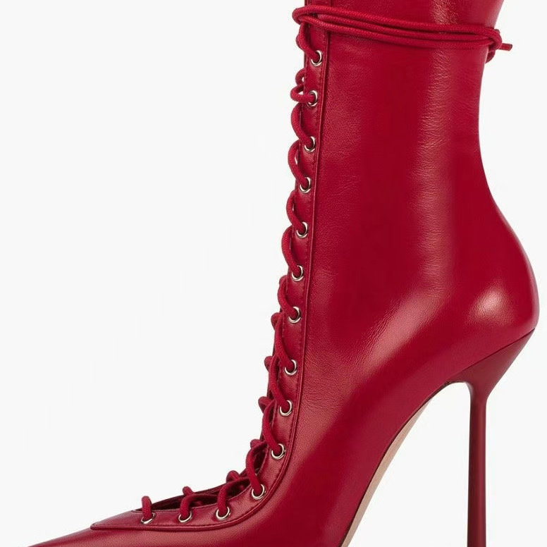 欧美外贸尖头系带短靴细高跟时装凉靴红色新娘婚靴夏网靴镂空单鞋