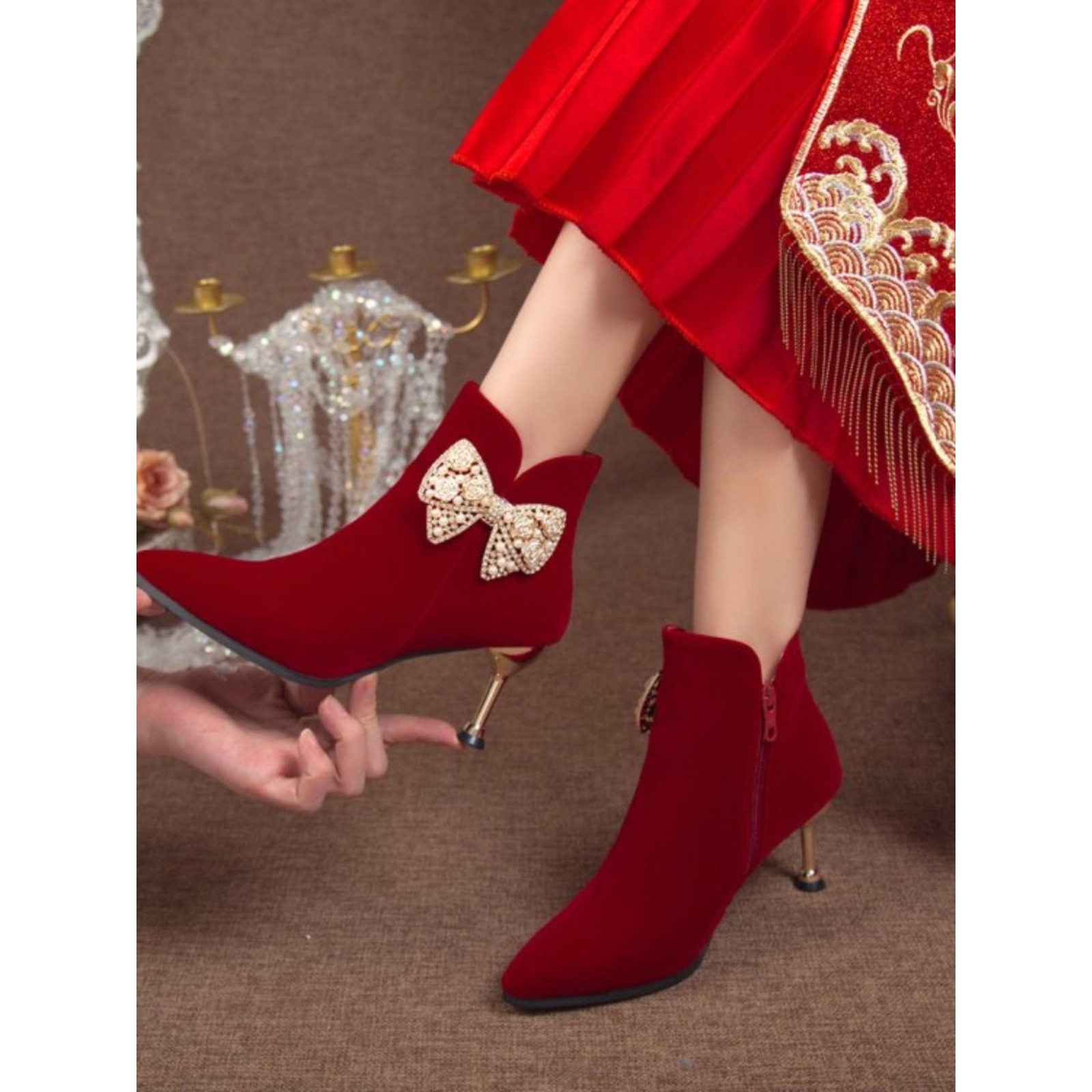 中式婚鞋女冬季短靴2024新款秀禾敬酒服婚靴红色新娘高跟鞋不累脚