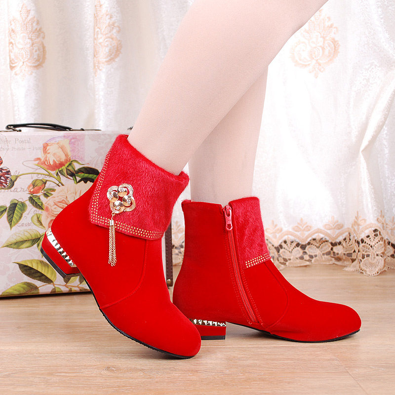 平底婚靴结婚鞋女冬季红色低跟大码新娘鞋加绒棉靴子粗跟红鞋短靴