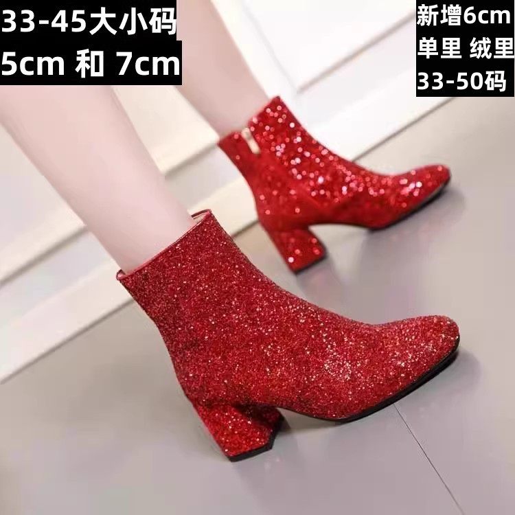 夏欧美外贸方头亮片红色新娘婚靴粗跟大码演出高跟短靴婚纱马丁靴