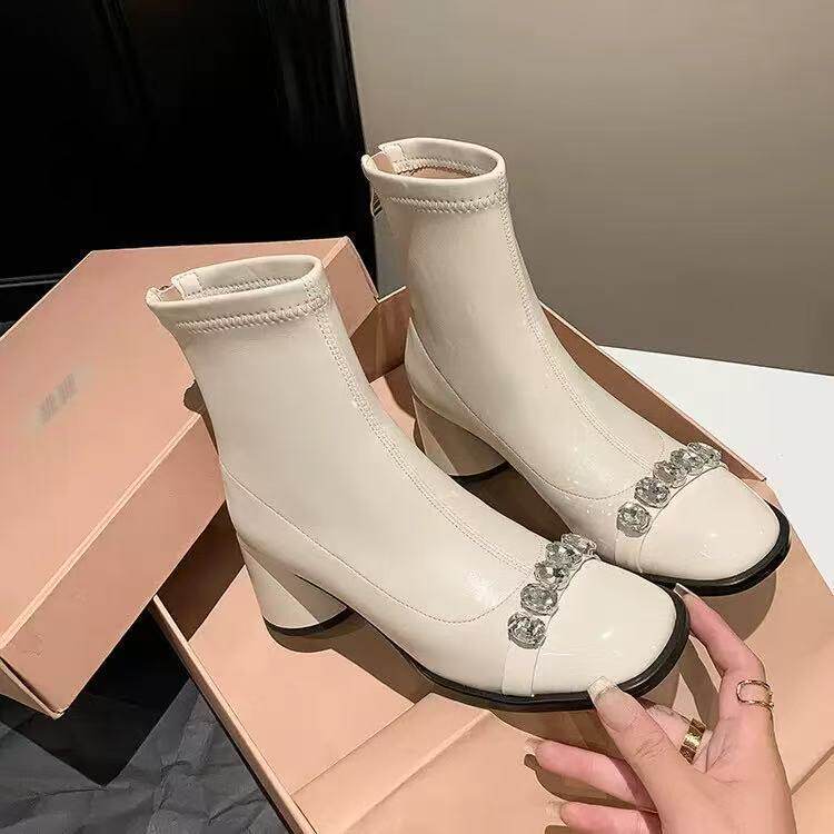 牛皮版~miu小奢水钻法式圆头粗跟休闲百搭弹力瘦瘦靴秋冬高跟短靴