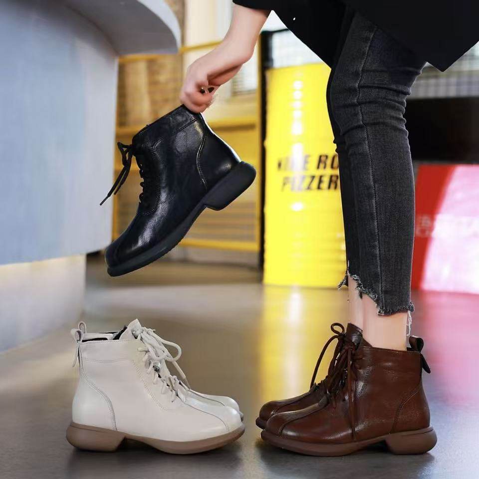 冬季复古做旧圆头红色皮鞋女系带马丁靴短靴单靴婚靴女靴鞋子大码