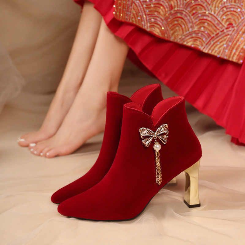 婚鞋新娘鞋冬天加绒粗跟2023新款冬季红色高跟鞋女结婚靴子不累脚