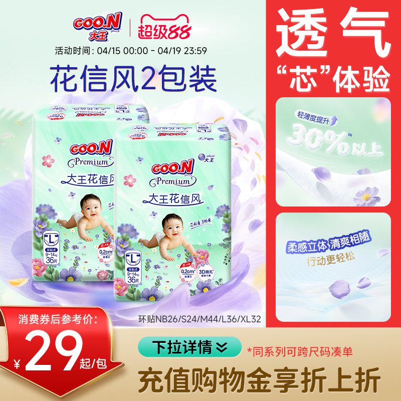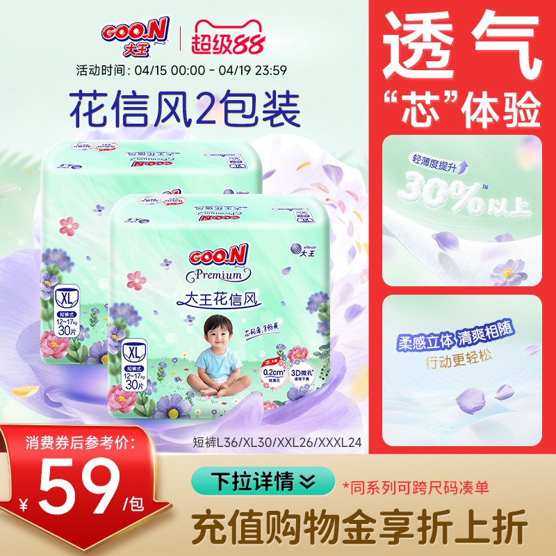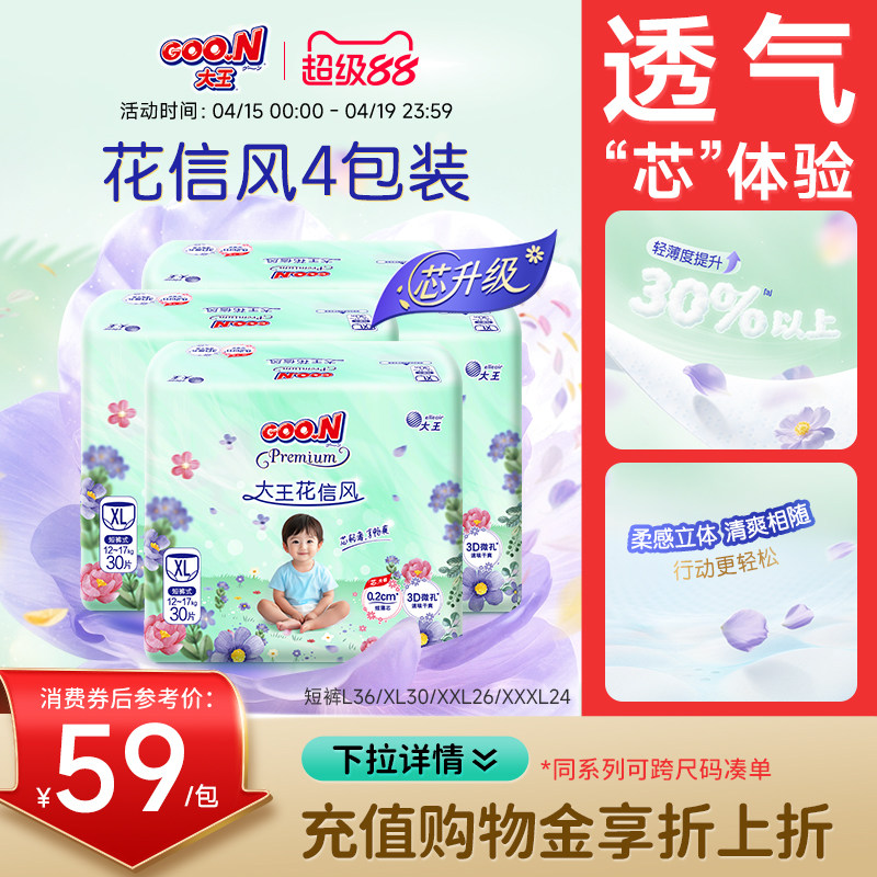 大王花信风升级款纸尿裤NB/S/M/L/XL成长裤L/XL/2XL/3XL超薄透气
