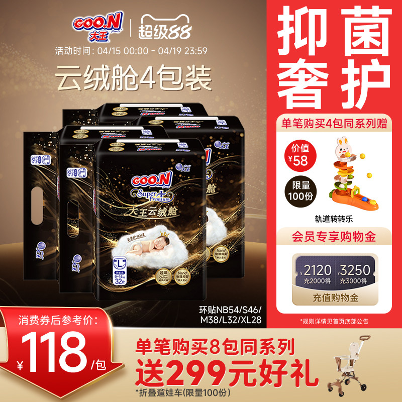 【物理抑菌>99%】大王云绒舱环贴式纸尿裤4包装干爽透气尿不湿