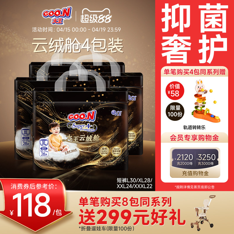 【物理抑菌>99%】大王云绒舱短裤式纸尿裤4包装干爽透气拉拉裤