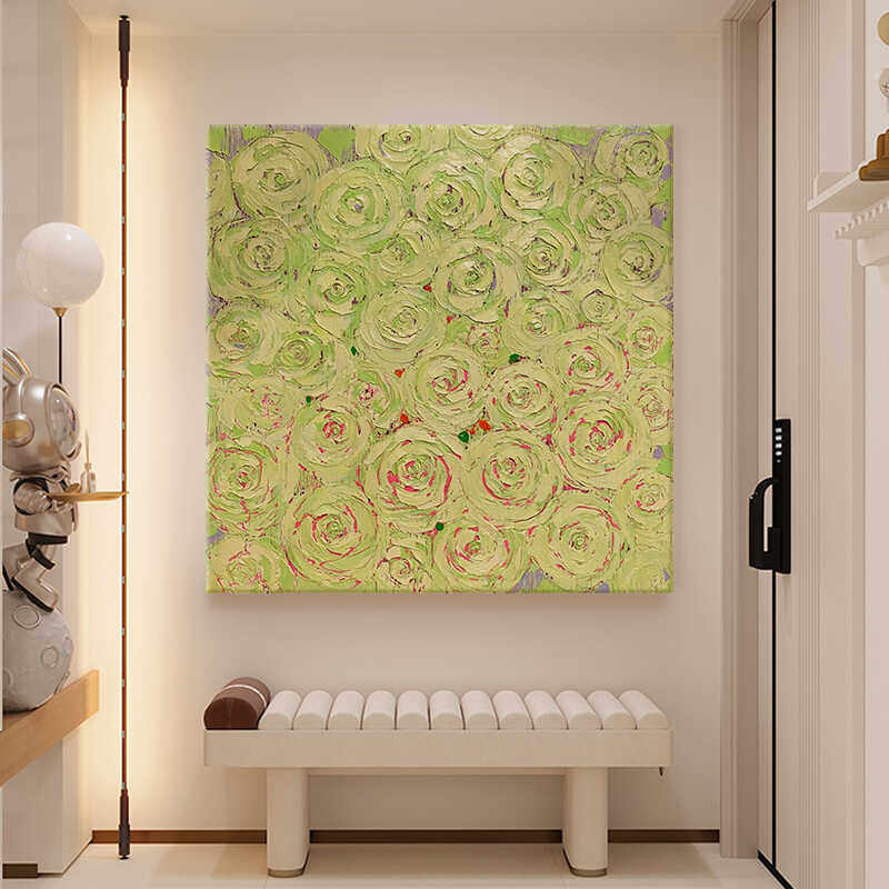 奶油风手绘油画绿色花卉客厅装饰画玄关挂画餐厅现代简约抽象壁画