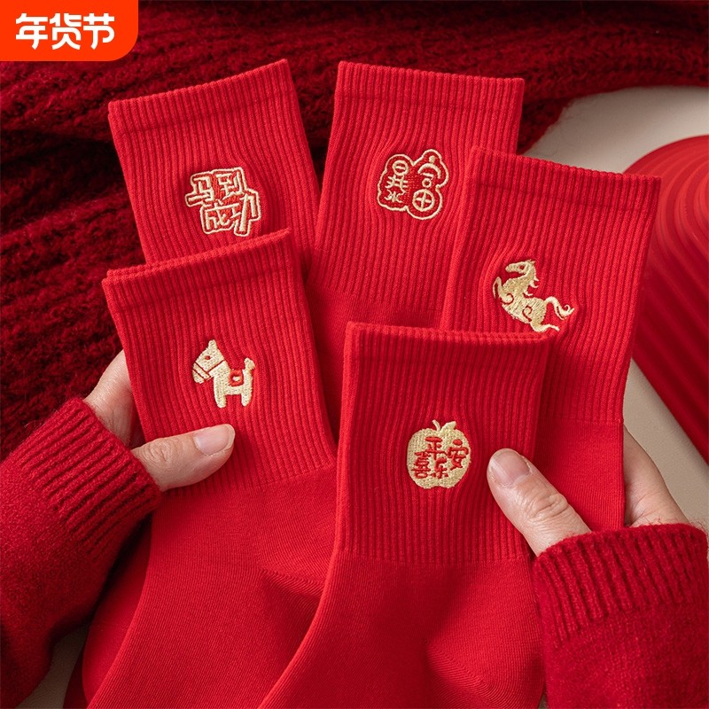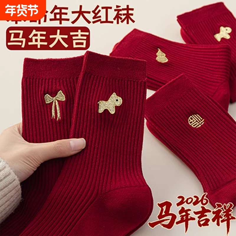 本命年红袜子男女马年中筒袜2026新年礼物踩人小结婚长袜棉礼盒装