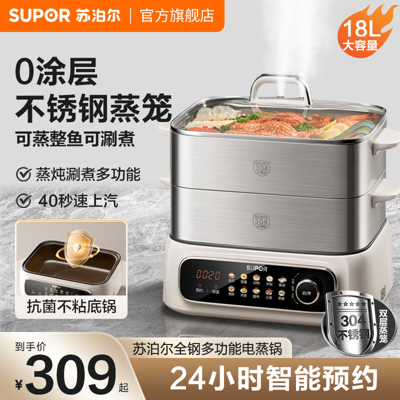 苏泊尔有钛电蒸锅家用多功能智能预约蒸煮一体三层18L不锈钢蒸笼