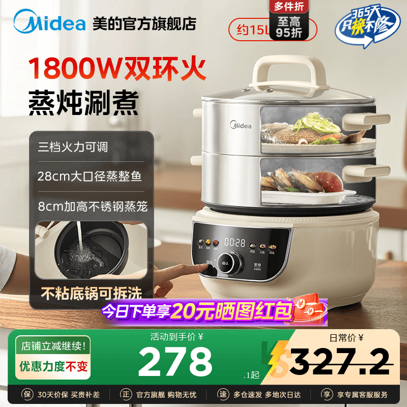 美的电蒸锅多功能家用三层蒸煮一体早餐机多层大容量煮锅2026新款