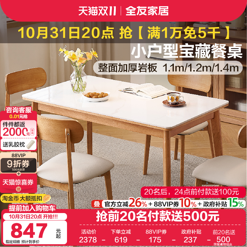 全友家居北欧风2025新款客厅家用小户型岩板餐桌长方形实木脚饭桌