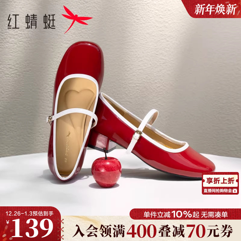 红蜻蜓红色玛丽珍2025新款女鞋婚鞋法式粗跟绝美小香风单鞋女皮鞋