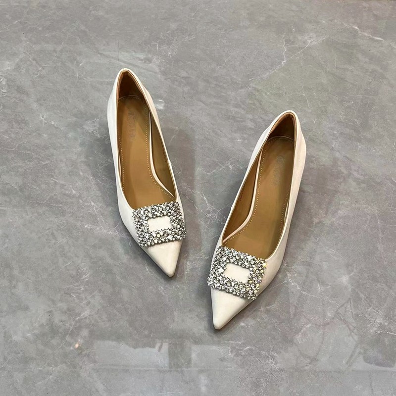 康莉真皮水钻浅口单鞋2025年春夏季商场新款尖头方扣低跟女鞋婚鞋