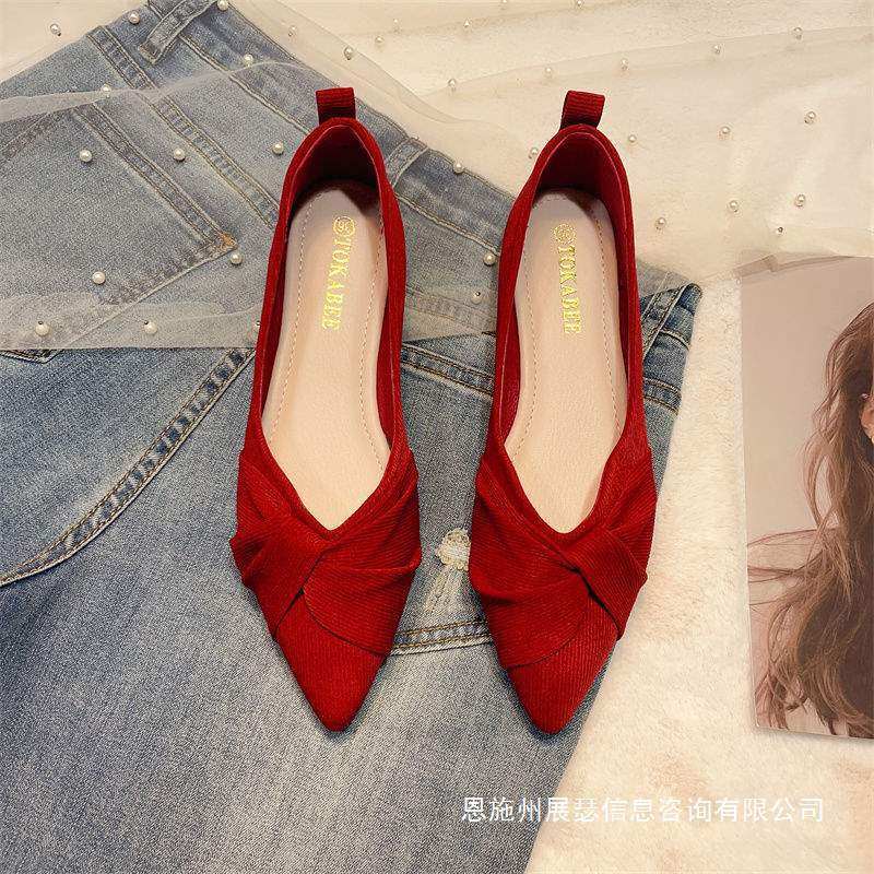 金步康红色单鞋女新款春秋百搭浅口瓢鞋仙女风淑女鞋婚鞋软底尖头