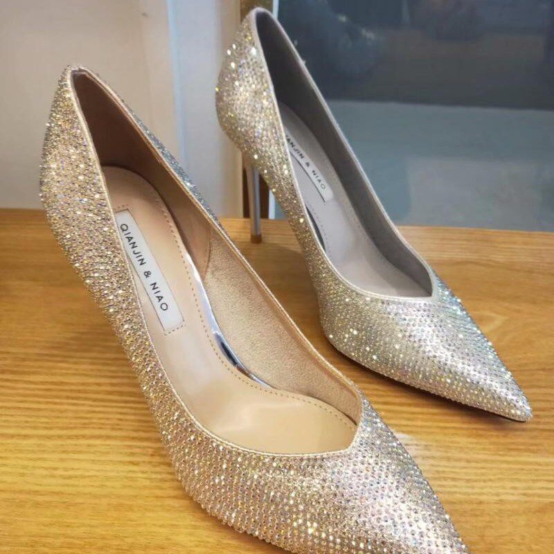 2020女新款银色金色尖头高跟鞋女细跟闪亮彩色水钻单鞋女鞋婚鞋