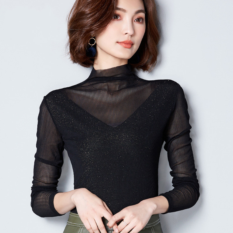 2019秋装新款网纱打底衫女长袖外穿雪纺衫设计感内搭黑色蕾丝上衣